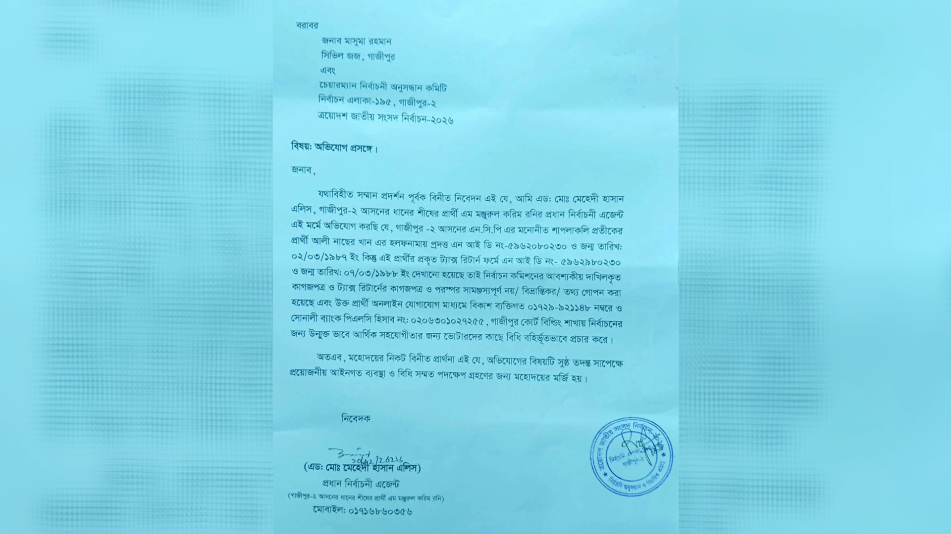 গাজীপুর প্রতিনিধি- হলফনামায় তথ্য গোপনের অভিযোগে গাজীপুর-২ আসনের এনসিপি প্রার্থী আলী নাছের খানের বিরুদ্ধে আইনানুগ ব্যবস্হা গ্রহণের জন্য আবেদন করেছেন